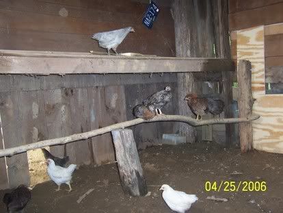 This second pic is inside the coop. I have 3 blue Americauna chickens which are my favorite of all. (You can see one on the top shelf.) The large white chicken is named KFC, the small white named Nugget. Yes, you guessed it. If we ever eat any of them it will be those two. ;)